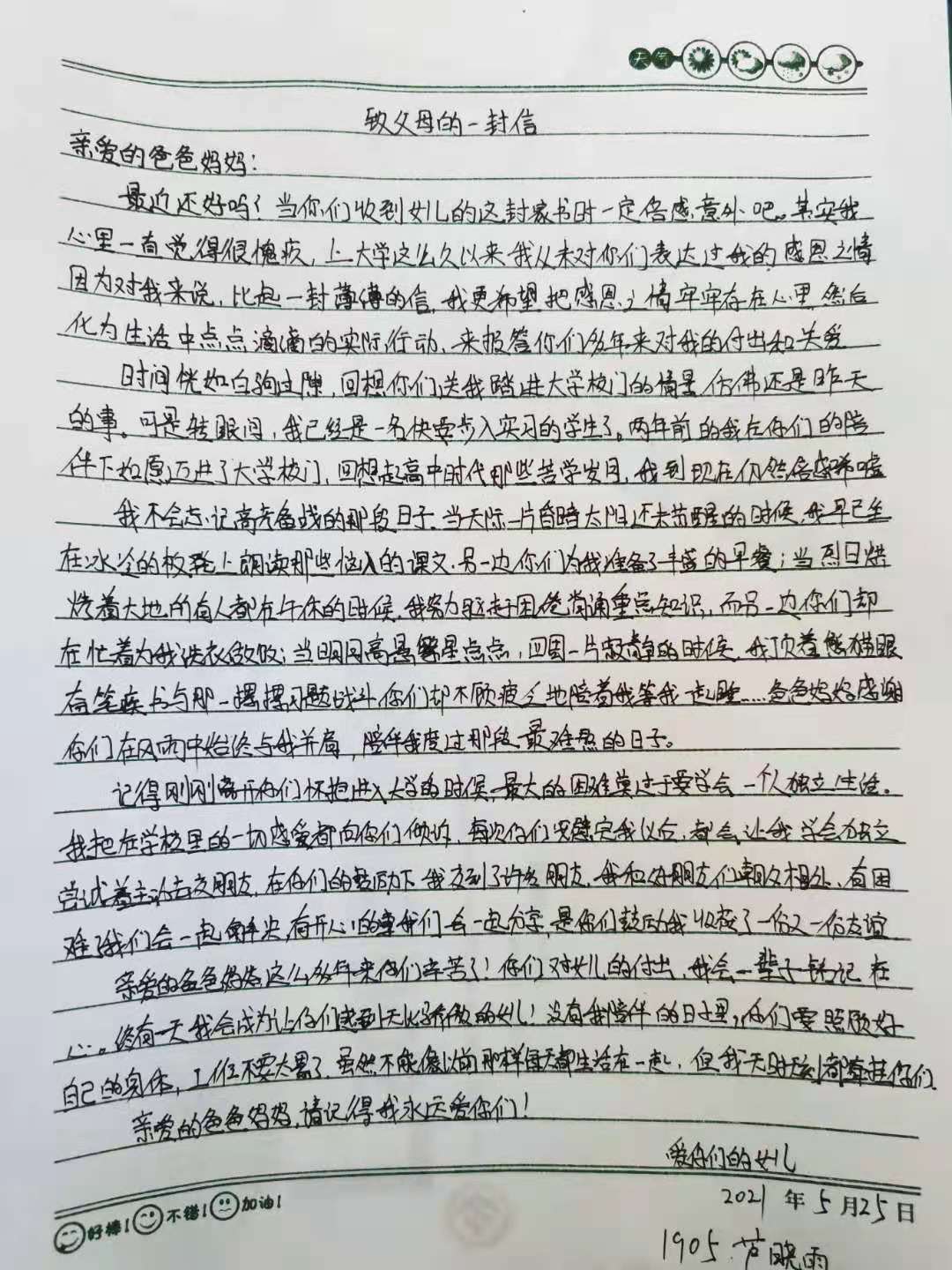 父母之爱譬如熹光,是那么温柔平和,每时每刻温暖着校园内的莘莘学子。2021年5月25日开展的“温情五月,感恩有您”主题活动旨在让学生明晰父母的养育之恩,理解父母的关爱。活动中,每个教室内都洋溢着浓浓的感恩之情,各班团支部纷纷开展各式各样的活动,例如献给母亲的一封信、分享感恩故事、我为家人画板报等等,还运用书信、视频、绘画、故事等多种方式表达对父母的感恩之情。同学们通过本次活动对感恩父母有了更深的理解,其中许多同学眼中均泛起朵朵泪花,感叹父母的艰辛与不易,并表示将尽己所能理解父母、主动帮助父母等等,要用自己的实际行动去感谢他们。
