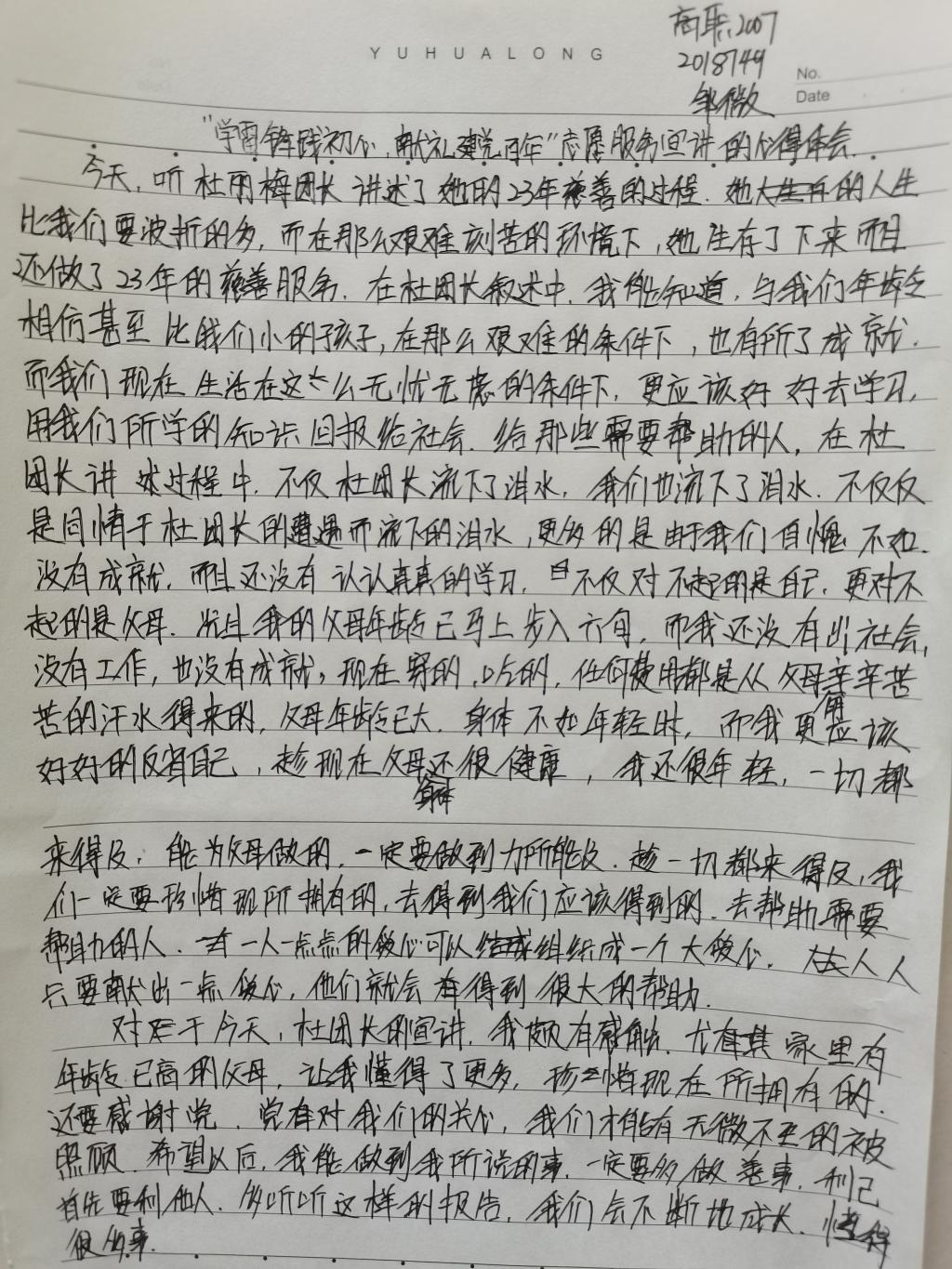 本次活动有幸邀请到丽梅爱心团团长杜丽梅女士为同学们讲述自己多年的慈善经历。她的慈善经历十分丰富,例如曾经的流浪孩子通过她的资助和鼓励,从班级倒数最终考取盘山县的重点高中;用全部积蓄全力救治白血病儿童;在她与癌症抗击的同时,仍不忘挂念灾区,亲临现场安抚灾区灾民等等。她告诉同学们,如果有困难可以咨询她,并表示要将慈善进行到人生的最后一刻。在座的每一位,无不被她的真挚和善良感动,她是党的好儿女,是人民的大英雄!