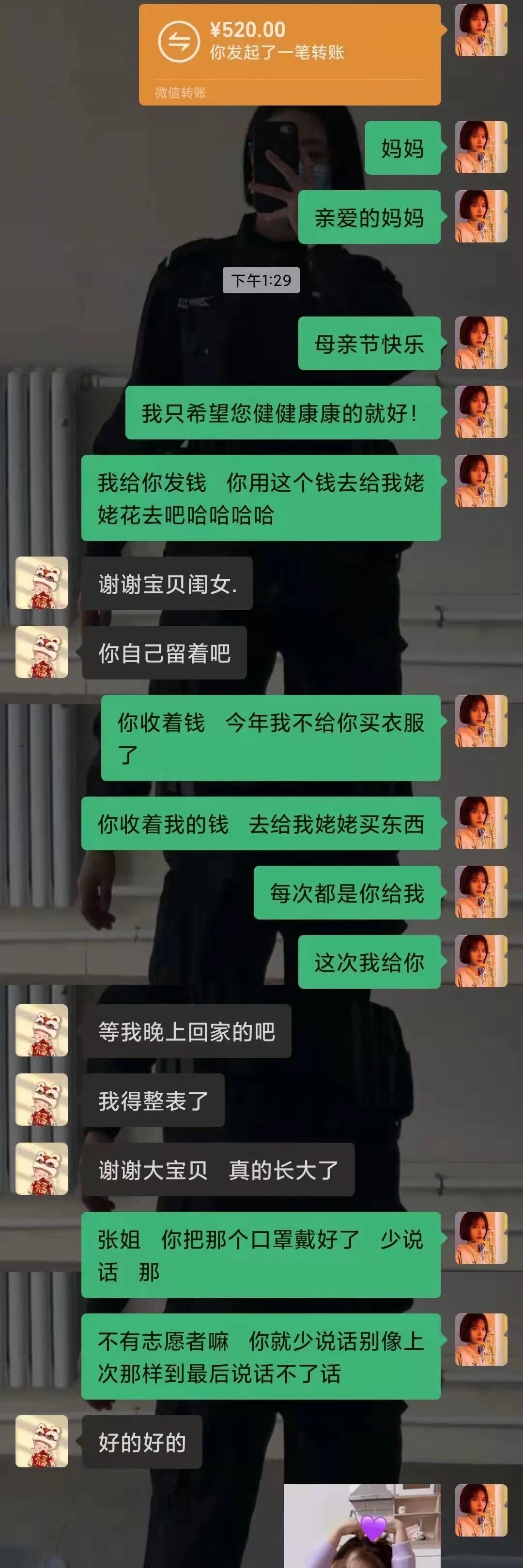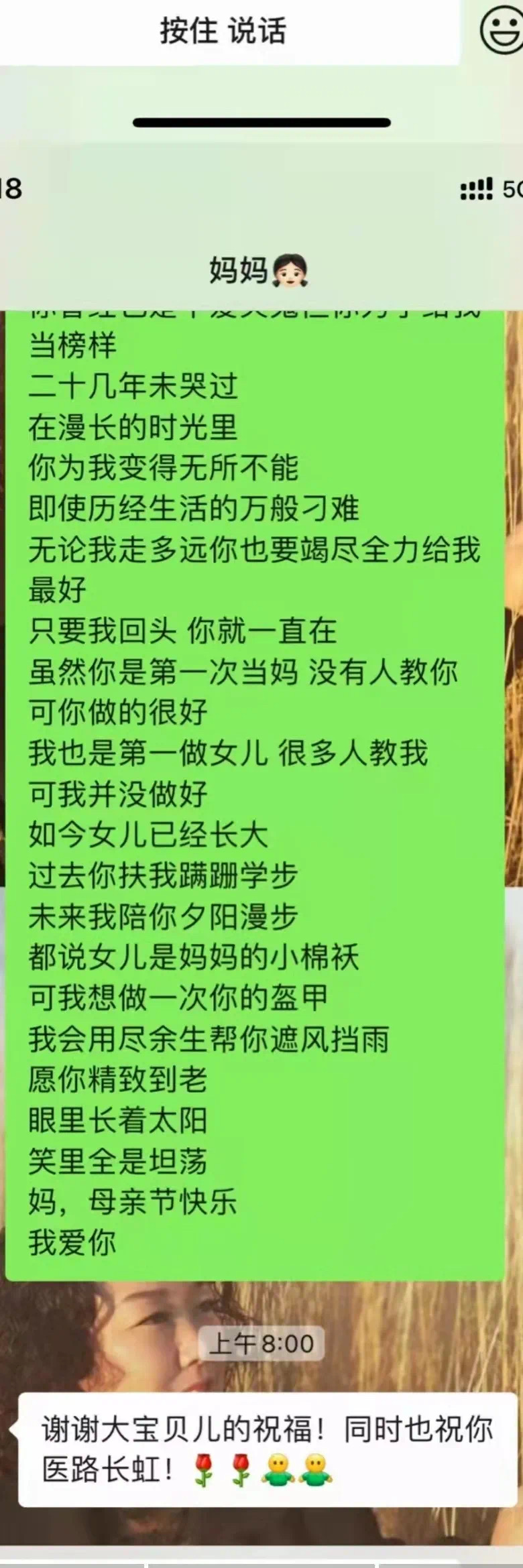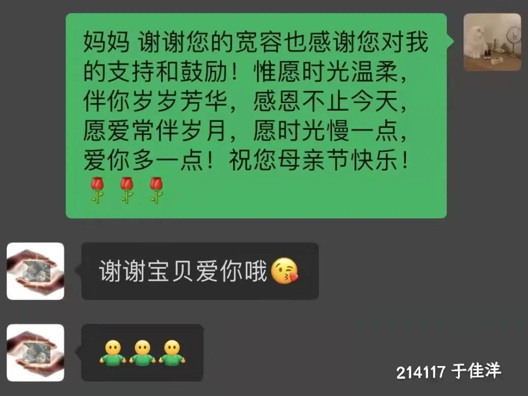 学生们用多种方式表达对妈妈的祝福与关爱。有的给妈妈写信并拍照发给给母亲,有的和妈妈微信聊天表达对母亲的感恩等等。一句亲切的问候,一个拥抱的表情,一颗感恩的心,字里行间都流露着对母亲的爱。