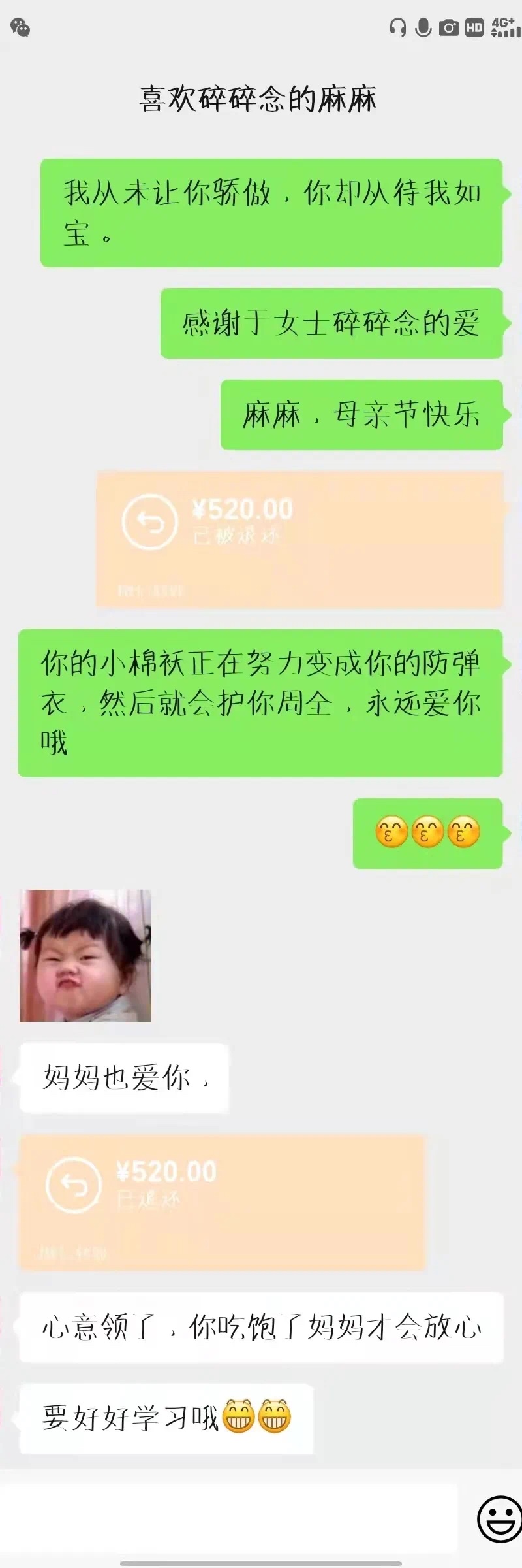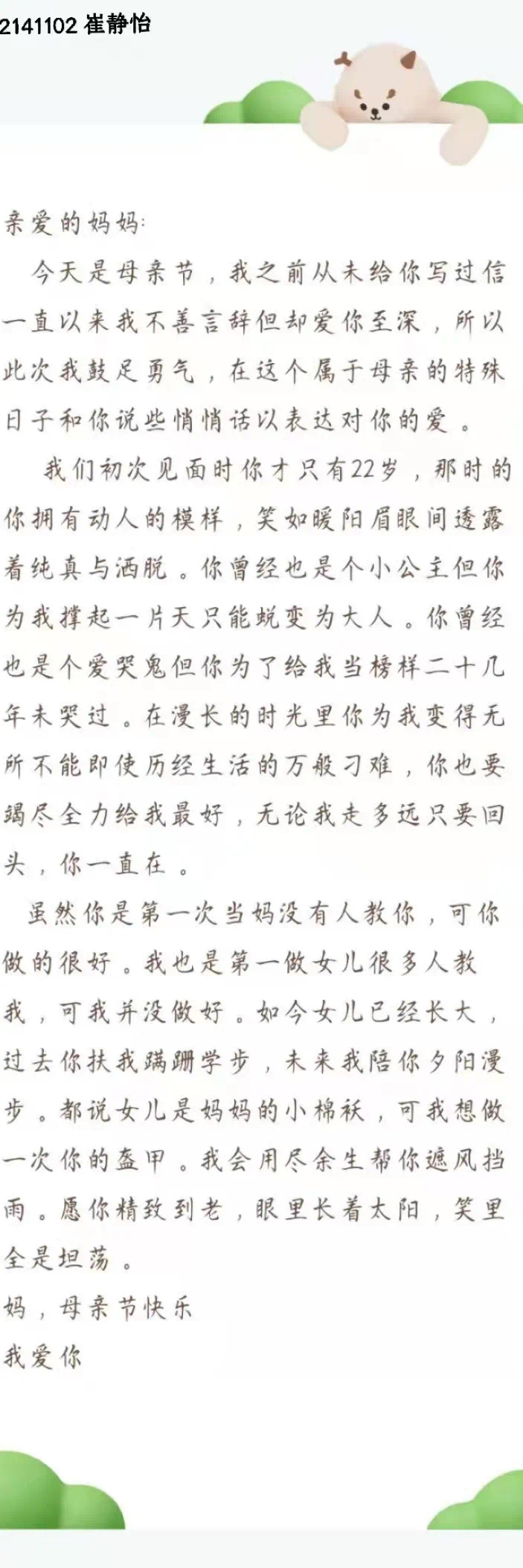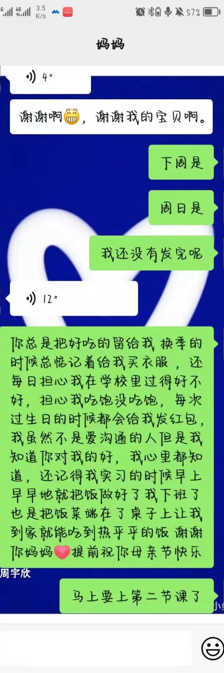 学生们用多种方式表达对妈妈的祝福与关爱。有的给妈妈写信并拍照发给给母亲,有的和妈妈微信聊天表达对母亲的感恩等等。一句亲切的问候,一个拥抱的表情,一颗感恩的心,字里行间都流露着对母亲的爱。