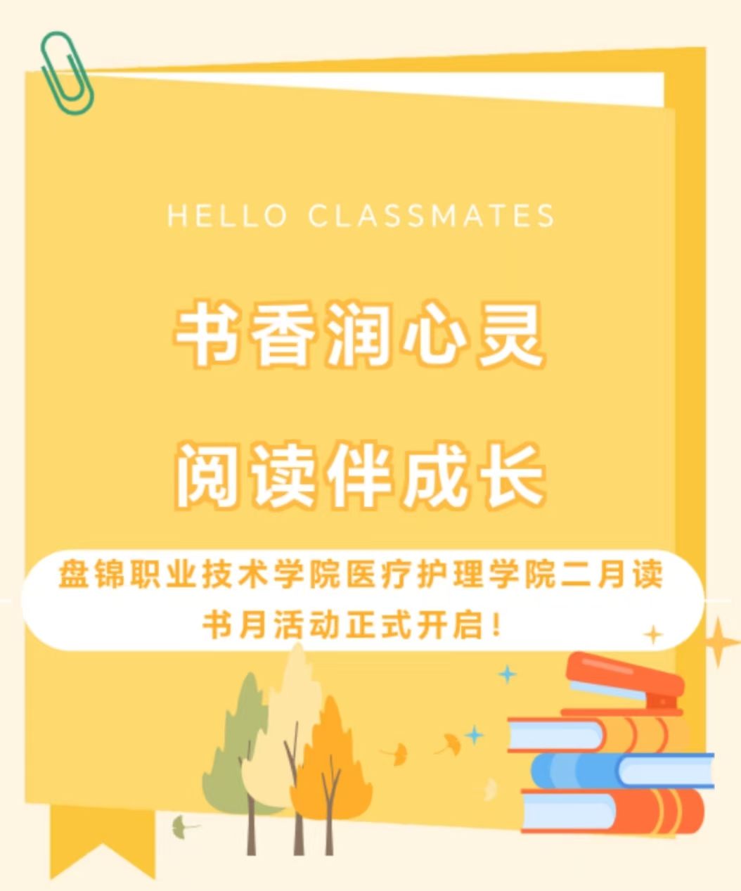 同学们,读书月的号角已经吹响,让我们一起行动起来,用阅读点亮生活,用知识充实自我!在这个二月,让我们与书为伴,与智慧同行,共同书写属于我们的精彩篇章!
