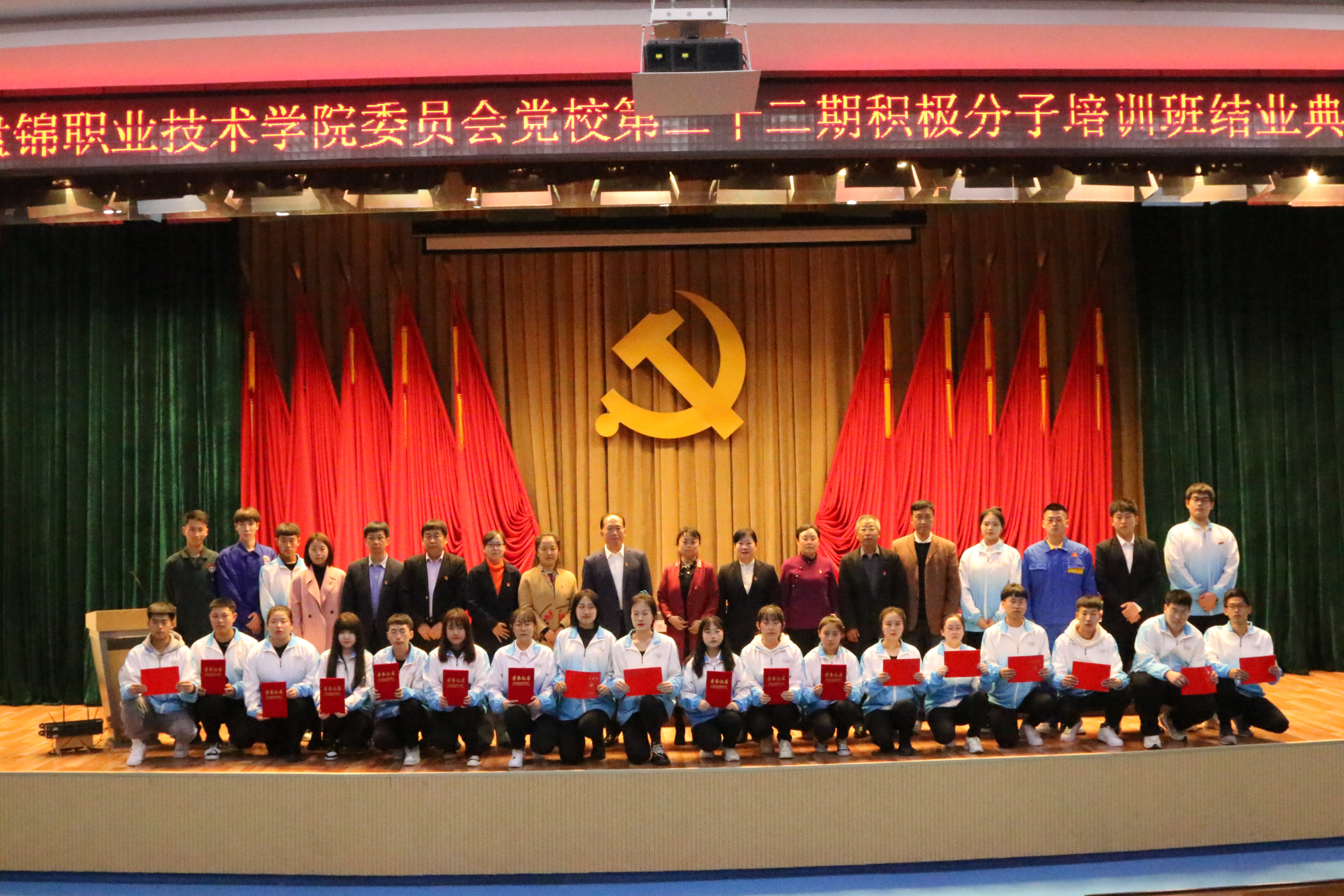11月10日盘锦职业技术学院第二十二期入党积极分子培训班结业典礼在图书馆一楼报告厅顺利举行。学院党委副书记李兵、八个分院系党支部书记、支委会成员及全体入党积极分子参加本次结业典礼。