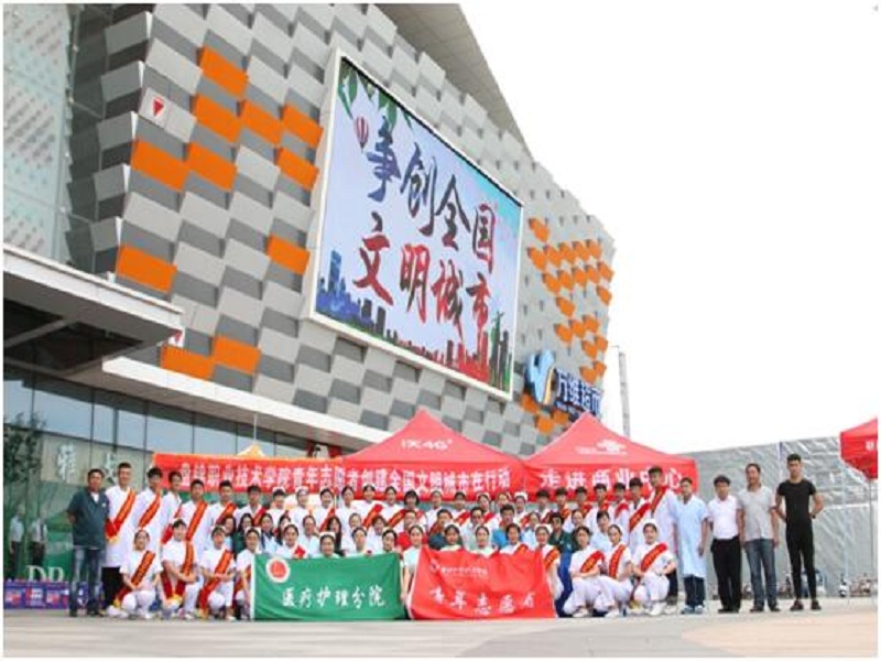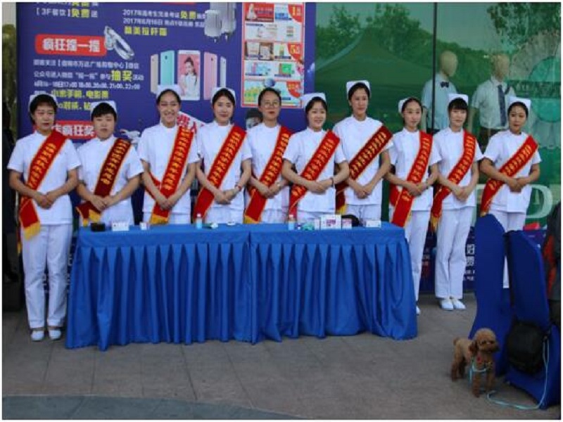 为深入宣传创建市级文明城市工作,医疗护理学院继昨日“情系敬老院”义诊活动之后,于2017年6月11日,在兴隆台万达广场开展大型义诊活动,旨在向广大市民进行文明城市创建的宣传工作,同时为广大市民普及健康知识。学校党委王正东书记、党委工作部杨宝航部长、团委蔡志远书记、医疗护理学院李冬院长、王艳华书记、姚文山副院长、郭强副院长、陈平海副书记、苏再兴主任以及范华、张玉婷、张胜凯、张果、王莹、王秀琴、董莲诗、金莉、宋江涛、付敬萍、白柳、王聪、刘方方13名医疗护理学院老师及学生青年志愿者42名参与此次活动。