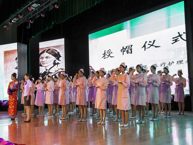 下午1:30分,授帽仪式在文化中心准时启幕。在温馨而庄严的音乐声中,50名即将步入实习岗位的护理专业学生代表身着圣洁的护士服,分批缓步走上授帽台,由学校领导和学院专业教师为她们戴上圣洁的护士帽。随后我学院张玉婷老师带领同学们在南丁格尔雕像前进行庄严宣誓,“我宣誓:以救死扶伤,防病治病为己任,以自己的真心、爱心、责任心对待我所护理的每一位病人……”整齐而响亮的声音回荡在文化中心的每一个角落,铭刻在每一位同学的心中。