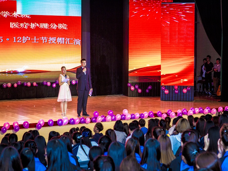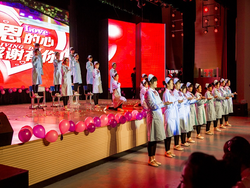 随后,文艺演出在“白衣天使”优美的舞姿中拉开帷幕。演出节目异彩纷呈,歌曲“和你一样”将手语与歌声完美结合,展示出护理人崇高的理想和信念。 热情奔放的“舞蹈串烧”充分展示了护理人的艺术才华以及爱校如家、无私奉献、积极进取的精神风貌。“护理知识竞赛”互动更是调动了台上台下所有人的气氛,堪称知识与艺术的完美融合。诗朗诵“天使之歌”把人带到一种无我的境界,充分展现了护理人爱校如家、无私奉献、积极进取的精神风貌。学院礼仪队还表演了护理礼仪,优雅的站姿、坐姿、 行姿,及规范的操作技巧,把现代护理学子的风采展现在众人面前。歌曲《明天会更好》抒发了学子们对梦想与美好生活的追求;演出中由护理学院马天延老师进行现场书法的表演,更是夺人眼球。与此同时精彩小魔术“求婚”上演了一朵玫瑰花的精彩人生。而接下来的“变身乐团”充分展现了身为男护士的他们一身的多才多艺。最后文艺演出在歌曲《感恩的心》中圆满落下帷幕。