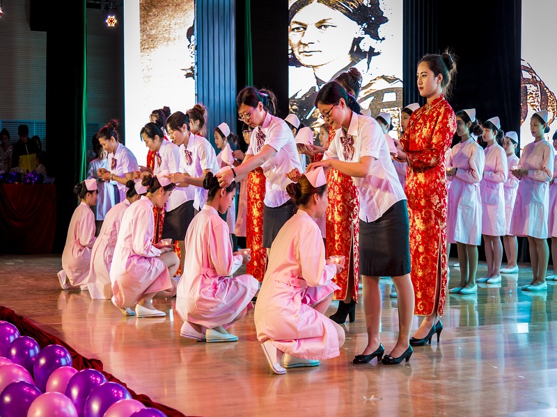 本次活动共分为测量血压,血糖等义务活动、授帽仪式、“天使风采”文艺演出等三大部分。测量血压、血糖等义务活动于5月12日中午在我校的第一食堂和教工食堂进行,由医疗护理学院的部分老师和同学们身着整洁的护士服,手拿测试仪器和记录单为部分师生进行血压、血糖及身高体重等项目的测定,并热心的对同学们进行了健康知识的宣传和讲解。一群衣着整洁的白衣天使,像一朵朵竞相开放的花儿,成为了校园内一道亮丽的风景线。